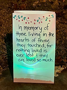 Let us know what you'd like on your memorial luminary; we can put a name, dates, nickname, quote, a memory, even your late grandmother's chocolate chip cookie recipe...whatever you want as long as we can fit it on the luminary. Let us know if you need more than 3 luminaries or if we can add more than one name per luminary. We will decorate your loved ones luminary & honor them in the best way that we know how.